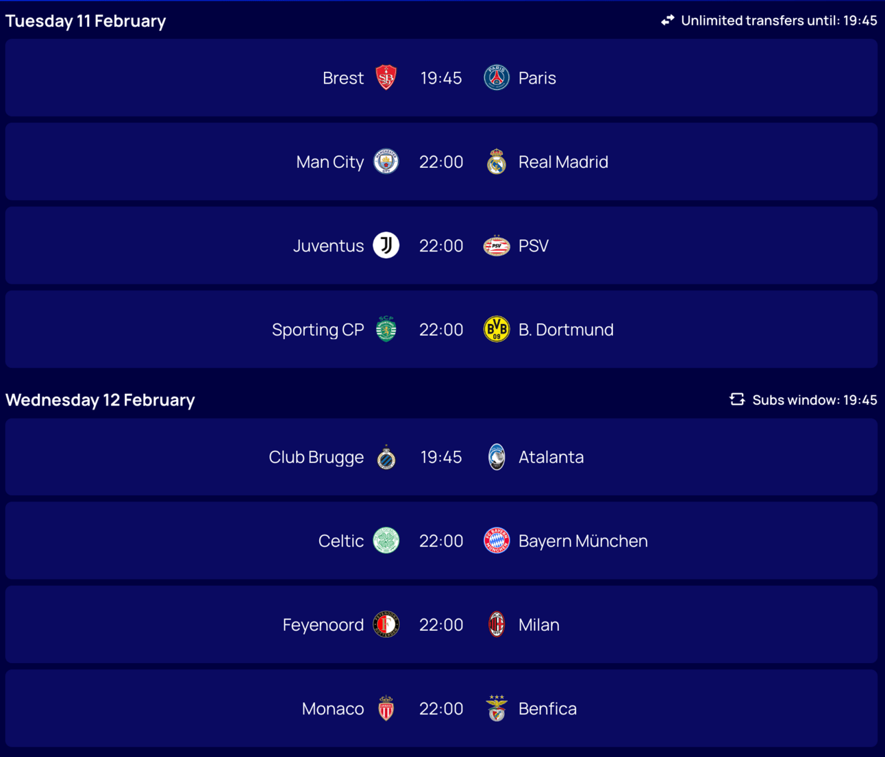 🚨 If you aren’t aware, everyone gets unlimited free transfers before this MD (9) and then unlimited free transfers out of the playoffs before MD11. So choose your 15 just based on the 2 playoff legs (MD9, MD10).