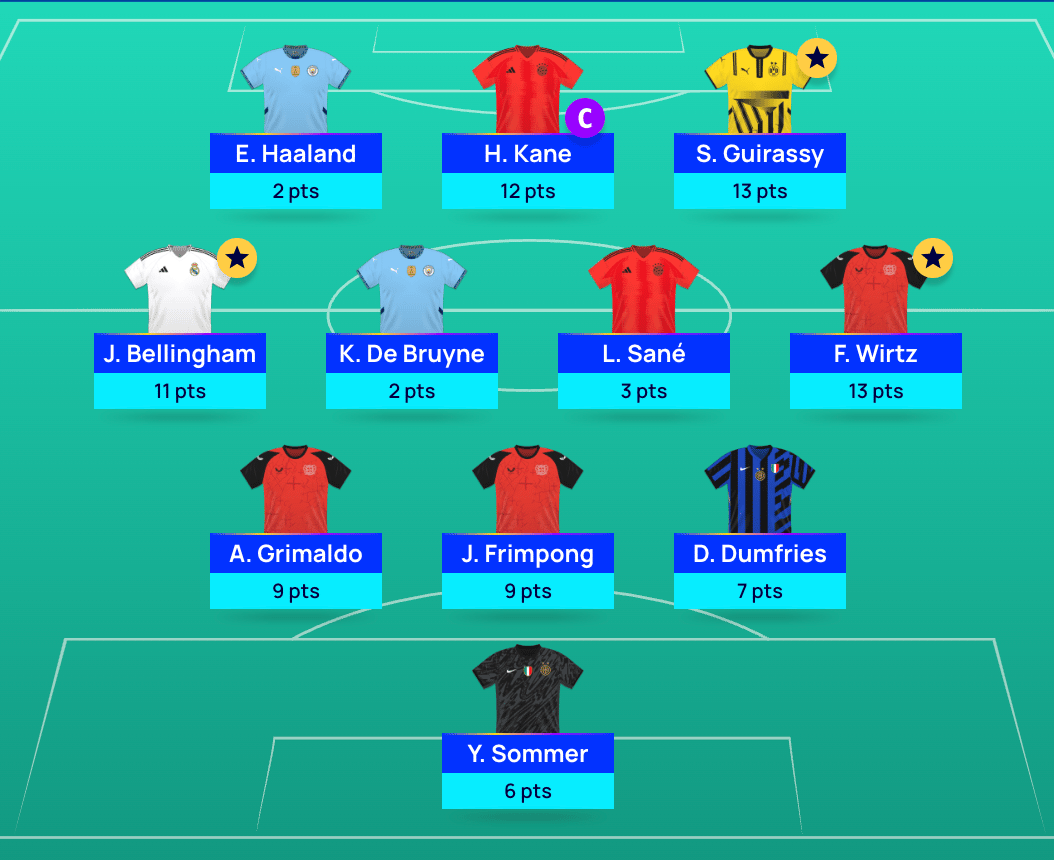 My main concern with playing the LL chip was having the same team as everyone else who was playing it, so I added in some changes. I avoided Mbappe and went with Guirassy which paid off. I also added in KDB instead of Foden and Sane instead of Musiala/Olise - those two did nothing.